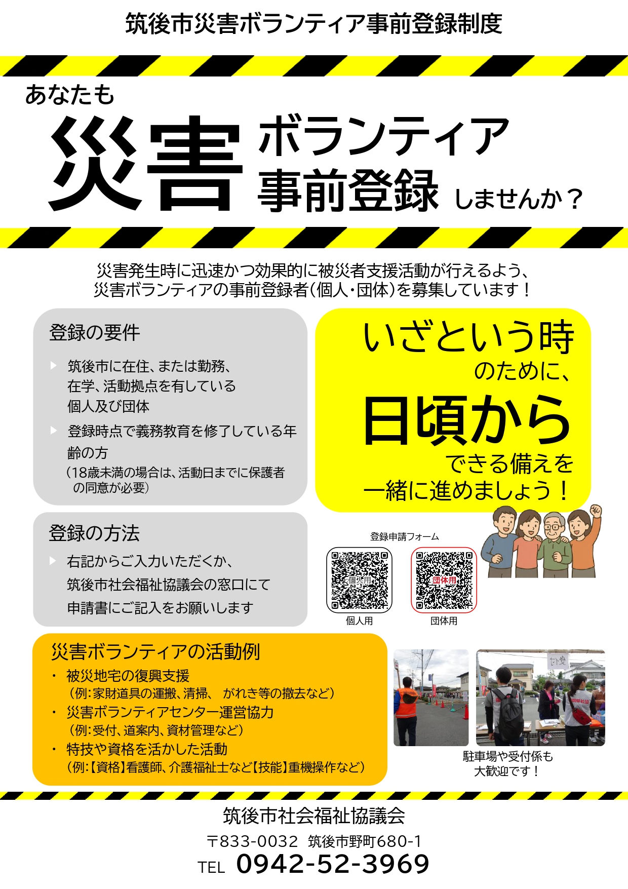 筑後市社会福祉協議会では、市内で災害が起きた場合に、必要に応じて災害ボランティアセンターを開設します。